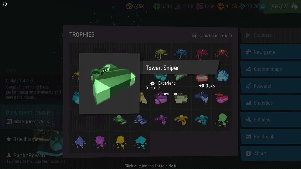 | Steps To Reproduce | On a mobile device with insufficient screen width in landscape orientation (e.g. moto e3), enable Large fonts in Settings. Start a game on any level, place a sniper, splash, venom, and/or multishot tower. Observe the first ability name (see screenshots attached) On that same device, open the trophy display window for the Sniper trophy, and observe the text for the trophy bonus (see screenshot attached). | ||||
