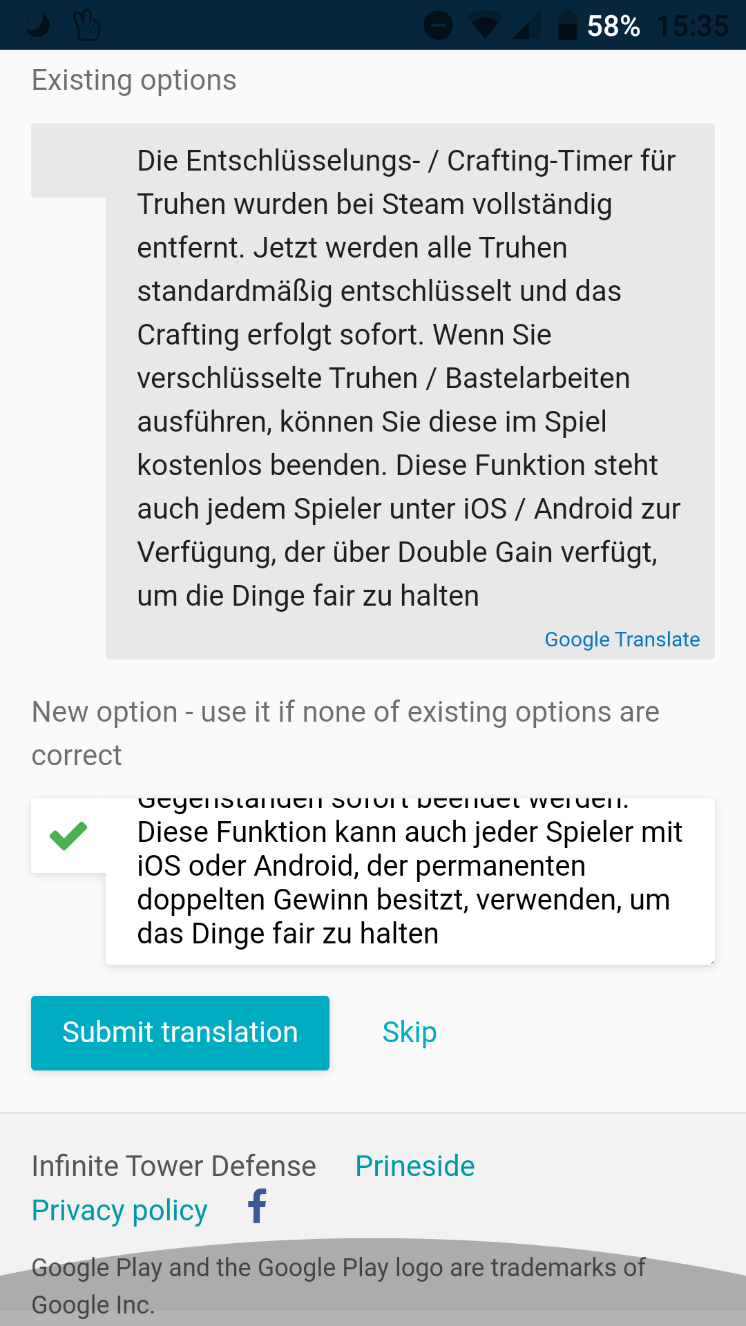 | Description | I really want help translation the game, but almost every string has to be edited. This won't be a problem if there wasn't following: But there is an EASY FIX for this: add a confirmatino dialog when pressing back AND add additional text to the bottom of the page so I can scroll so my keyboard does not hide the translation. | ||||