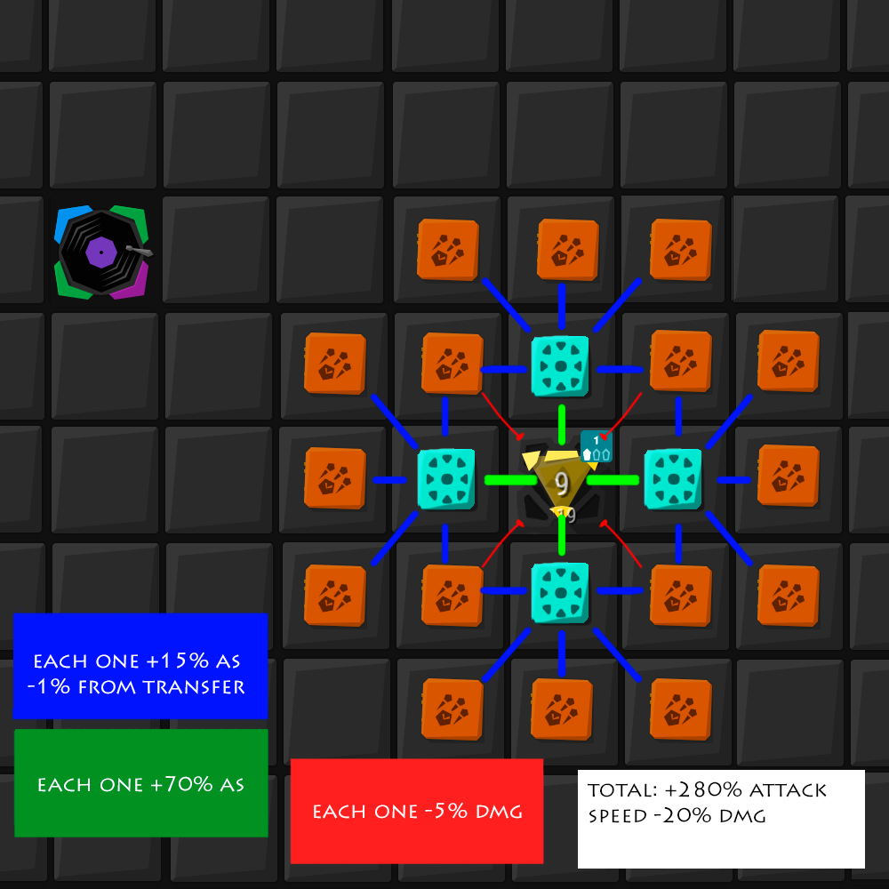 | Description | A new modifier that transfers the effects of the square to nearby towers or other modifiers of the same type. Each connected tower decreases the effect value of the original square by 10%. For example, you could put a tower on a 150% attack box, with a 150% range box and then an attack speed of 150. The tower would have 150% attack, 140 range (-10% from origin) and 130 speed (-10 for each transfer) It is not a huge advantage, since you have given up putting 3 towers with all the effects. Additionally, connecting too many towers to a transfer mod could result in negative enhancements. 8 towers connected to a modifier on 150% attack, would suppose 150-80 = 70% damage each tower, 30% less each one. They can also transfer the improvements of other different modules. With enough space a tower could be placed, surrounded by 5 transfer modules and each transfer module could have 4 attack speed modules. This would be very expensive | ||||