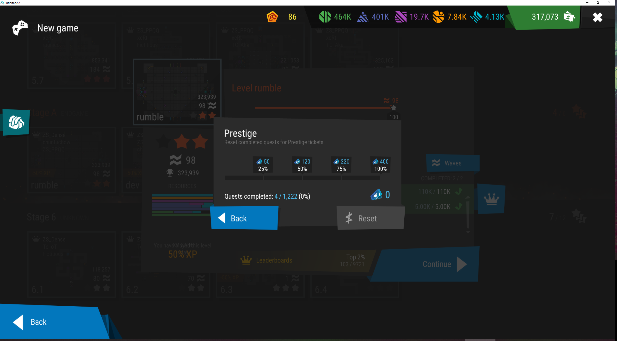 The game says I have 4/1222 quests completed right after resetting. I would expect having 0/1222. Most of these quests have Stars as quest rewards (6 with starts, 2 regular quests - see screenshots). I spent dozens of hours to get all those Star quests completed so that I can reset them. Note: The reset was performed at 25% milestone. | ||||