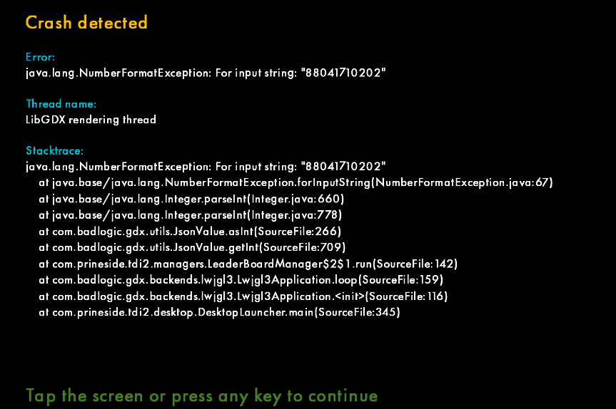 | Summary | 0002001: (b182 - beta version) Crash (+ softlock) - NumberFormatException for imput String "88041710202" (If i go to level select) | ||||
