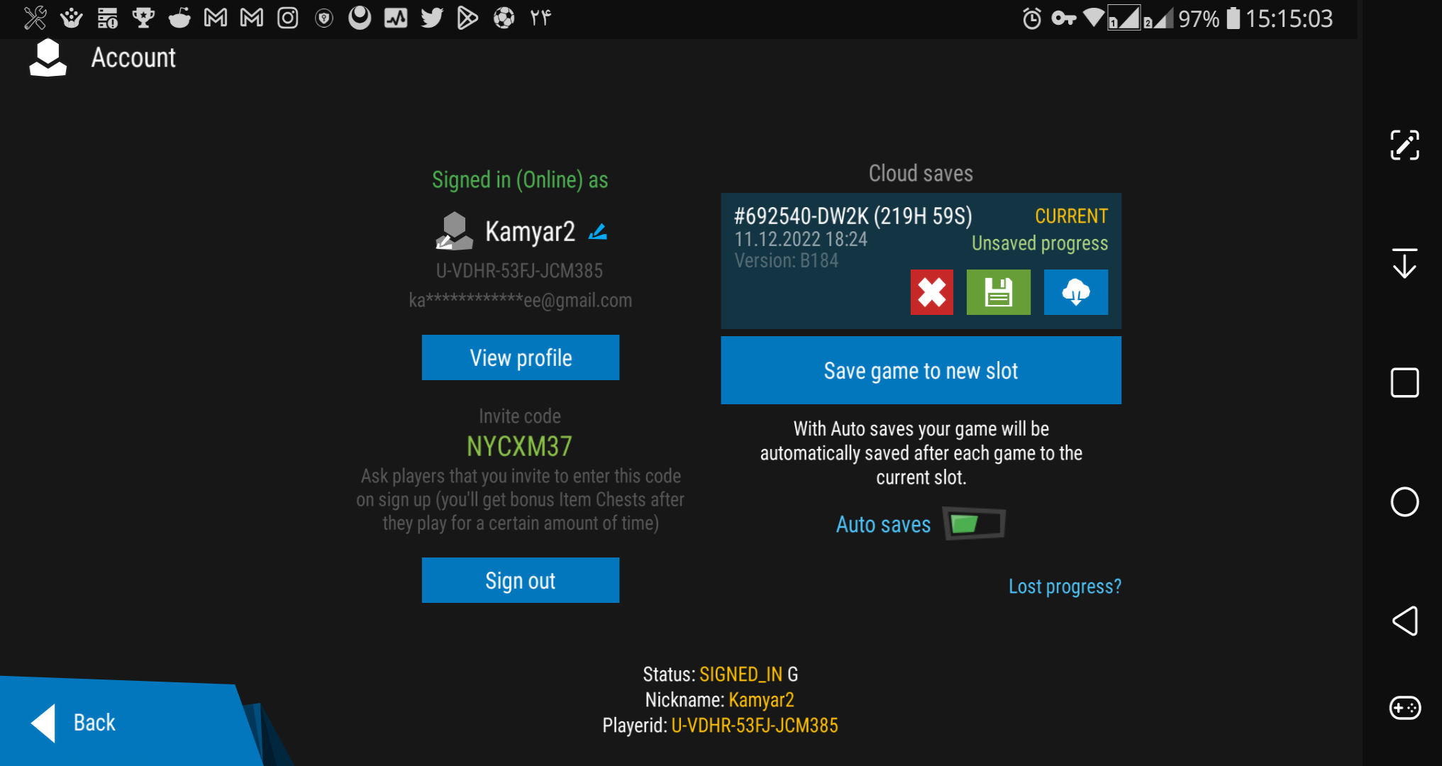| Description | Cloud saves not working from 11.12.2022 18:24 version B184 • I'm from Iran. • I've already download and install the latest update from Google store. Thanks for reply. | ||||