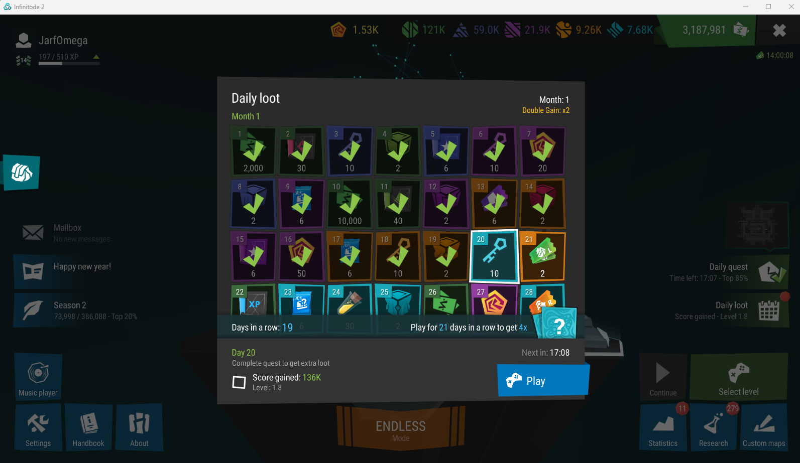 Added Screenshots. Daily Loot window to show quest goal and streak (!) that is about to disappear. Stats by game shows multiple games where I met the goal. Endless Win replay page included to show score beyond threshold. The important bits seem to be that the 136K quest never actually appears in-game and I also did a quest reset last night which seems like something that could have had an effect on this. DailyLoot_20240108_JarfOmega.png (401,383 bytes) |