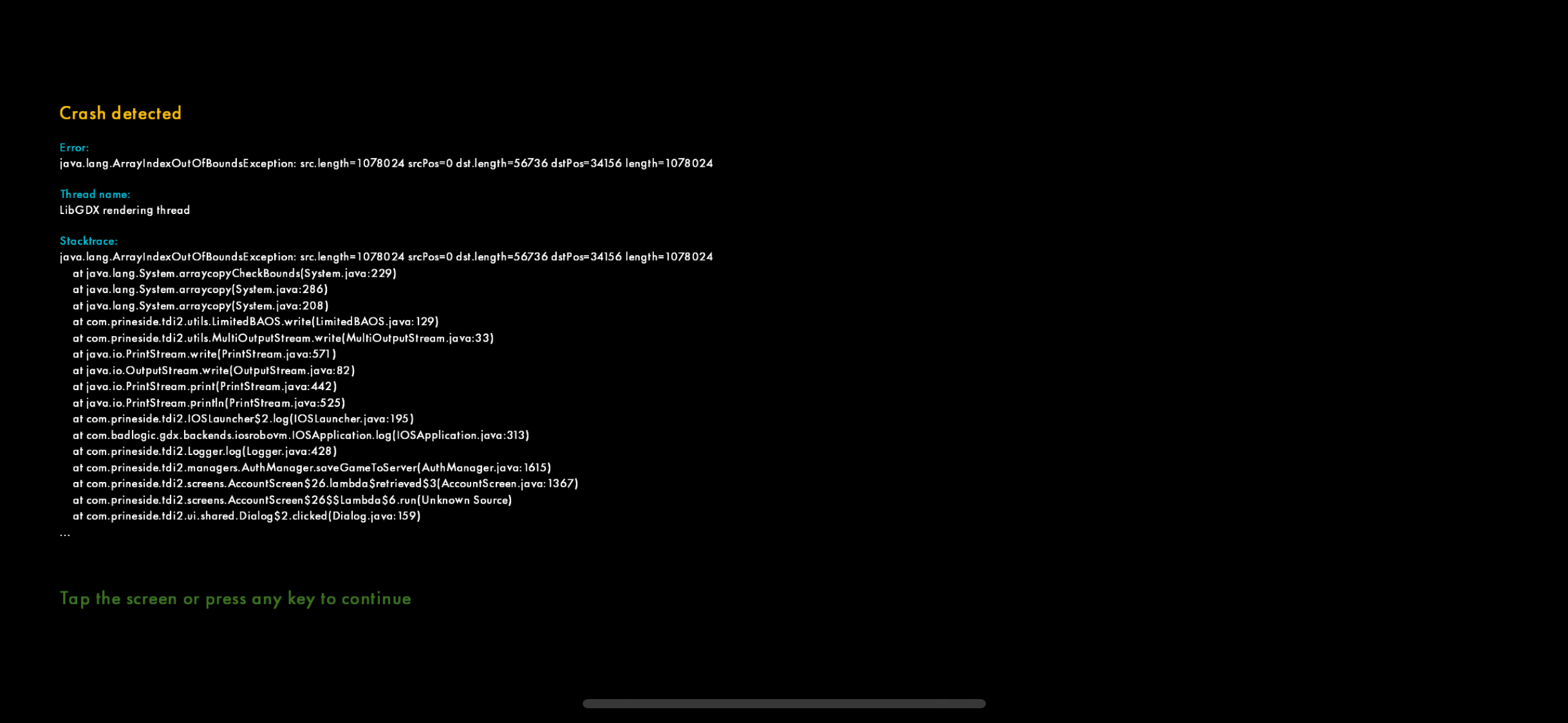 | Description | I am unable to save my game to the cloud manually in any form on the iOS app. Saving is normal for Android and on PC (Steam) Error from crash is shown here: | ||||