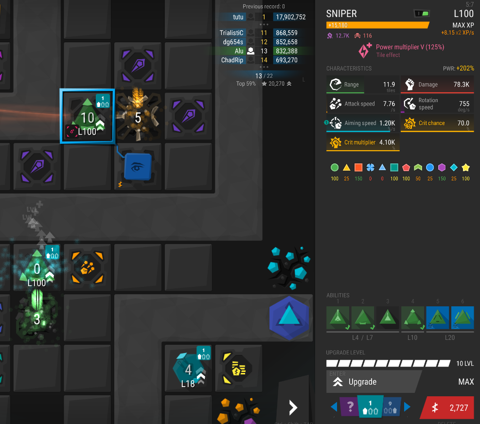 | Description | power multiplier tile (or platform) does not multiply power of tower, as the name implies. Instead it gives a flat bonus equal to the amount. This is not an issue for low research/xp but scales poorly into endless. Currently in beta, powerful ability multiplies power after taking power from power tile into effect (as it should). example: Solution: