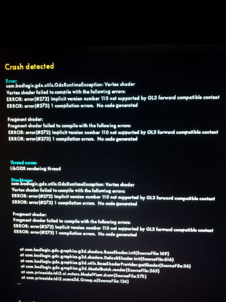 log.txt.1-2.zip (12,368 bytes)2024-08-10 16:44:25.607 D Logger added shutdown hook for dispose 2024-08-10 16:44:27.190 I DesktopLauncher SteamAPI loaded 2024-08-10 16:44:27.190 D DesktopLauncher Steam: Register user... 2024-08-10 16:44:27.228 D DesktopLauncher Steam: Register user stats callback... 2024-08-10 16:44:27.230 D DesktopLauncher Steam: Register Utils... 2024-08-10 16:44:27.231 D DesktopLauncher Steam: Register Apps... 2024-08-10 16:44:27.232 D DesktopLauncher Steam: Register Friends... 2024-08-10 16:44:27.252 D DesktopLauncher Steam: Local user account ID: 166970990 2024-08-10 16:44:27.253 D DesktopLauncher Steam: Local user steam ID: 76561198127236718 2024-08-10 16:44:27.253 D DesktopLauncher Steam: App ID: 937310 2024-08-10 16:44:27.253 D DesktopLauncher Steam: App build ID: 15217375 2024-08-10 16:44:27.254 D DesktopLauncher Steam: App owner: 166970990 2024-08-10 16:44:27.254 D DesktopLauncher Steam: App purchase time: 1681590784 2024-08-10 16:44:27.254 D DesktopLauncher Steam: App subscribed from free weekend: false 2024-08-10 16:44:27.254 D DesktopLauncher Steam: App subscribed: true 2024-08-10 16:44:27.255 D DesktopLauncher Steam: Friends persona name: darayauaush 2024-08-10 16:44:27.255 D DesktopLauncher full screen mode enabled through config, applying 2024-08-10 16:44:29.145 I SettingsManager getBestFullscreenMode 1920 1080 1920 1080 2024-08-10 16:44:29.202 I SettingsManager best fullscreen mode: 1920x1080, bpp: 24, hz: 60 2024-08-10 16:44:29.205 I DesktopLauncher full screen mode set to values specified in config 2024-08-10 16:44:32.088 I CrashHandler Crash report saved 2024-08-10 16:44:32.089 E CrashHandler Uncaught exception in thread LibGDX rendering thread (Error compiling shader: Vertex shader Vertex shader failed to compile with the following errors: ERROR: error(#272) Implicit version number 110 not supported by GL3 forward compatible context ERROR: error(#273) 1 compilation errors. No code generated Fragment shader: Fragment shader failed to compile with the following errors: ERROR: error(#272) Implicit version number 110 not supported by GL3 forward compatible context ERROR: error(#273) 1 compilation errors. No code generated ) java.lang.IllegalArgumentException: Error compiling shader: Vertex shader Vertex shader failed to compile with the following errors: ERROR: error(#272) Implicit version number 110 not supported by GL3 forward compatible context ERROR: error(#273) 1 compilation errors. No code generated Fragment shader: Fragment shader failed to compile with the following errors: ERROR: error(#272) Implicit version number 110 not supported by GL3 forward compatible context ERROR: error(#273) 1 compilation errors. No code generated at com.badlogic.gdx.graphics.g2d.SpriteBatch.createDefaultShader(SourceFile:170) at com.badlogic.gdx.graphics.g2d.SpriteBatch.<init>(SourceFile:127) at com.badlogic.gdx.graphics.g2d.SpriteBatch.<init>(SourceFile:81) at com.prineside.tdi2.screens.CrashReportScreen.<init>(SourceFile:34) at com.prineside.tdi2.managers.ScreenManager.goToCrashReportScreen(SourceFile:164) at com.prineside.tdi2.NormalGame.create(SourceFile:28) at com.badlogic.gdx.backends.lwjgl3.Lwjgl3Window.initializeListener(SourceFile:445) at com.badlogic.gdx.backends.lwjgl3.Lwjgl3Window.update(SourceFile:395) at com.badlogic.gdx.backends.lwjgl3.Lwjgl3Application.loop(SourceFile:195) at com.badlogic.gdx.backends.lwjgl3.Lwjgl3Application.<init>(SourceFile:167) at com.prineside.tdi2.desktop.DesktopLauncher.main(SourceFile:370) [java.lang.IllegalArgumentException: Error compiling shader: Vertex shader Vertex shader failed to compile with the following errors: ERROR: error(#272) Implicit version number 110 not supported by GL3 forward compatible context ERROR: error(#273) 1 compilation errors. No code generated Fragment shader: Fragment shader failed to compile with the following errors: ERROR: error(#272) Implicit version number 110 not supported by GL3 forward compatible context ERROR: error(#273) 1 compilation errors. No code generated ] 2024-08-10 16:44:33.942 I CrashHandler Sent report |