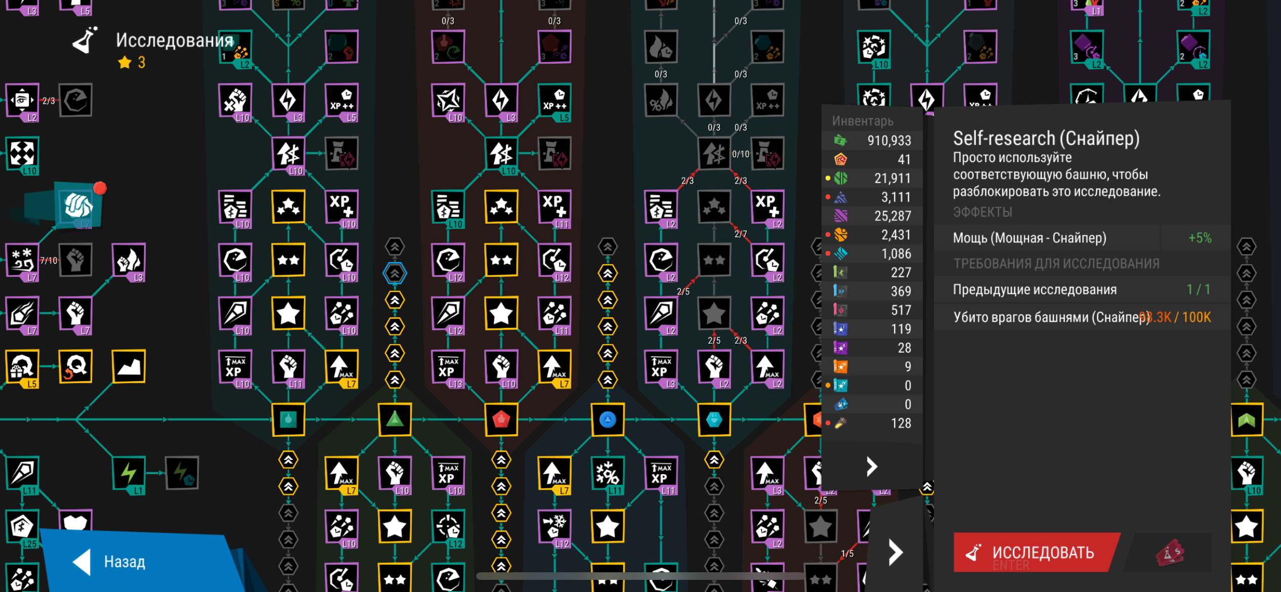 | Steps To Reproduce | Установить перевод «Русский». Крупный масштаб - выкл. Открыть дерево исследований. Выбрать пункт «Self-research башня (Снайпер)» номер 5 от башни. Надпись «Убито врагов башнями (Снайпер)» наползает на количество врагов, в итоге текст нечитаем. | ||||