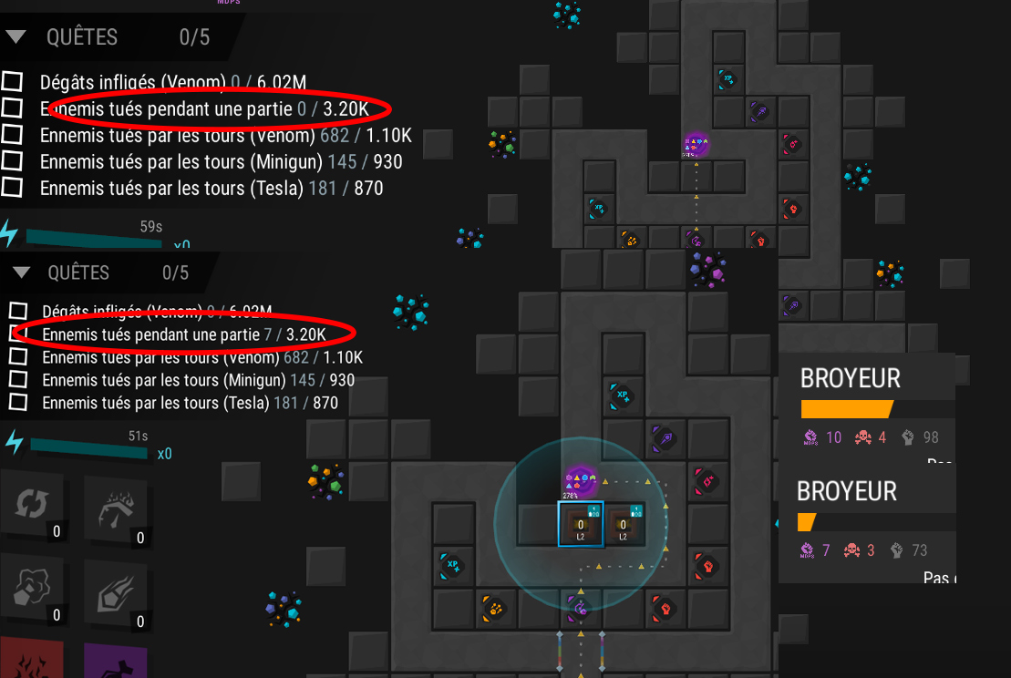 | Steps To Reproduce | Install a Crusher on a level with the "Enemies killed" quest active. I had other towers installed as well, not sure if there's a difference around that. | ||||