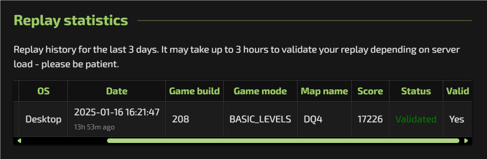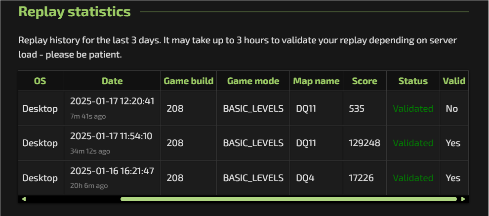 After additional testing, it has been determined that submitting by altering the date can pass replay verification, whereas modifying map parameters cannot. Since the date is linked to the randomness of daily quests, individuals exploiting this loophole might alter dates to upload replays that would not otherwise exist, ultimately undermining the fairness of the leaderboard. |
