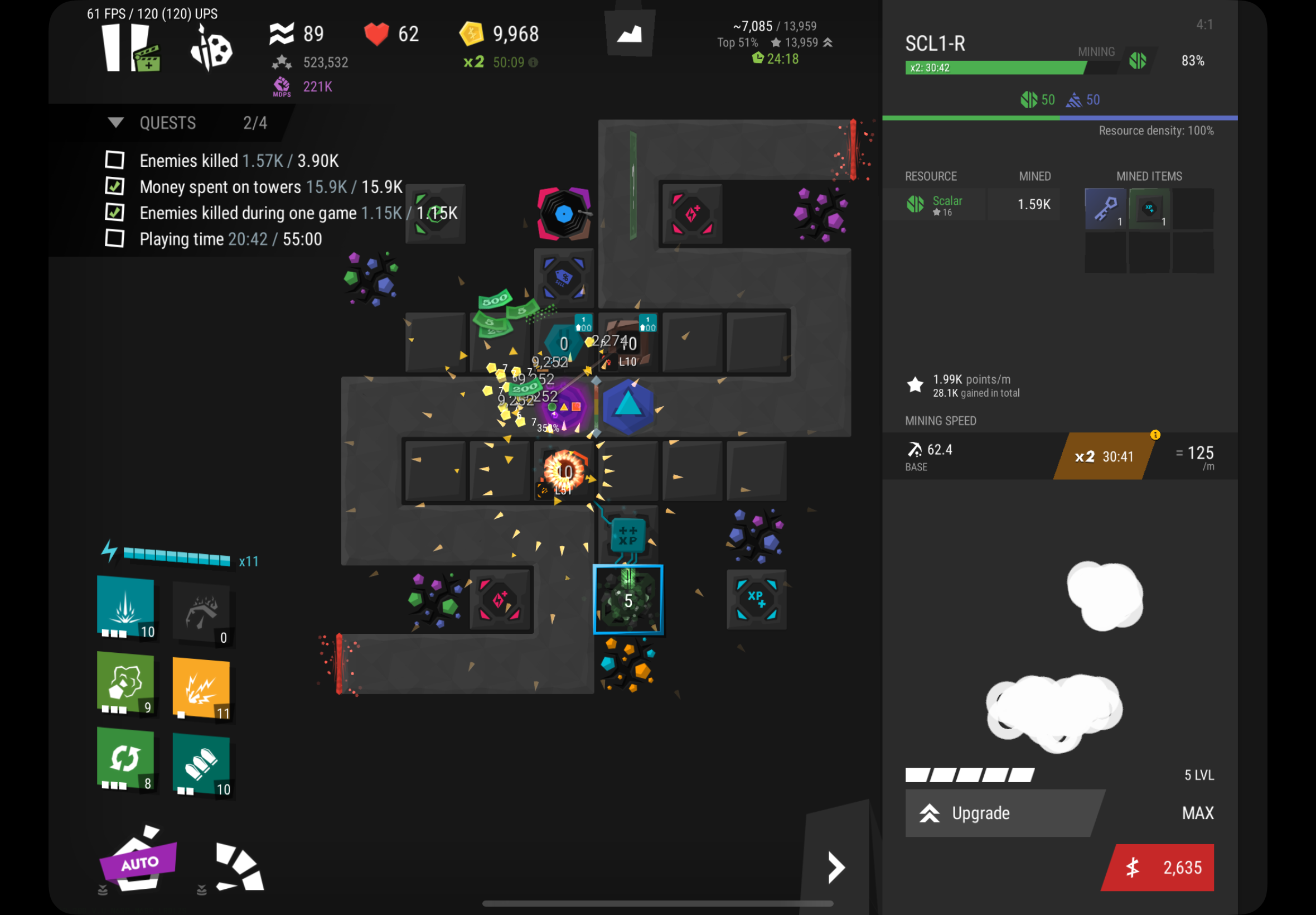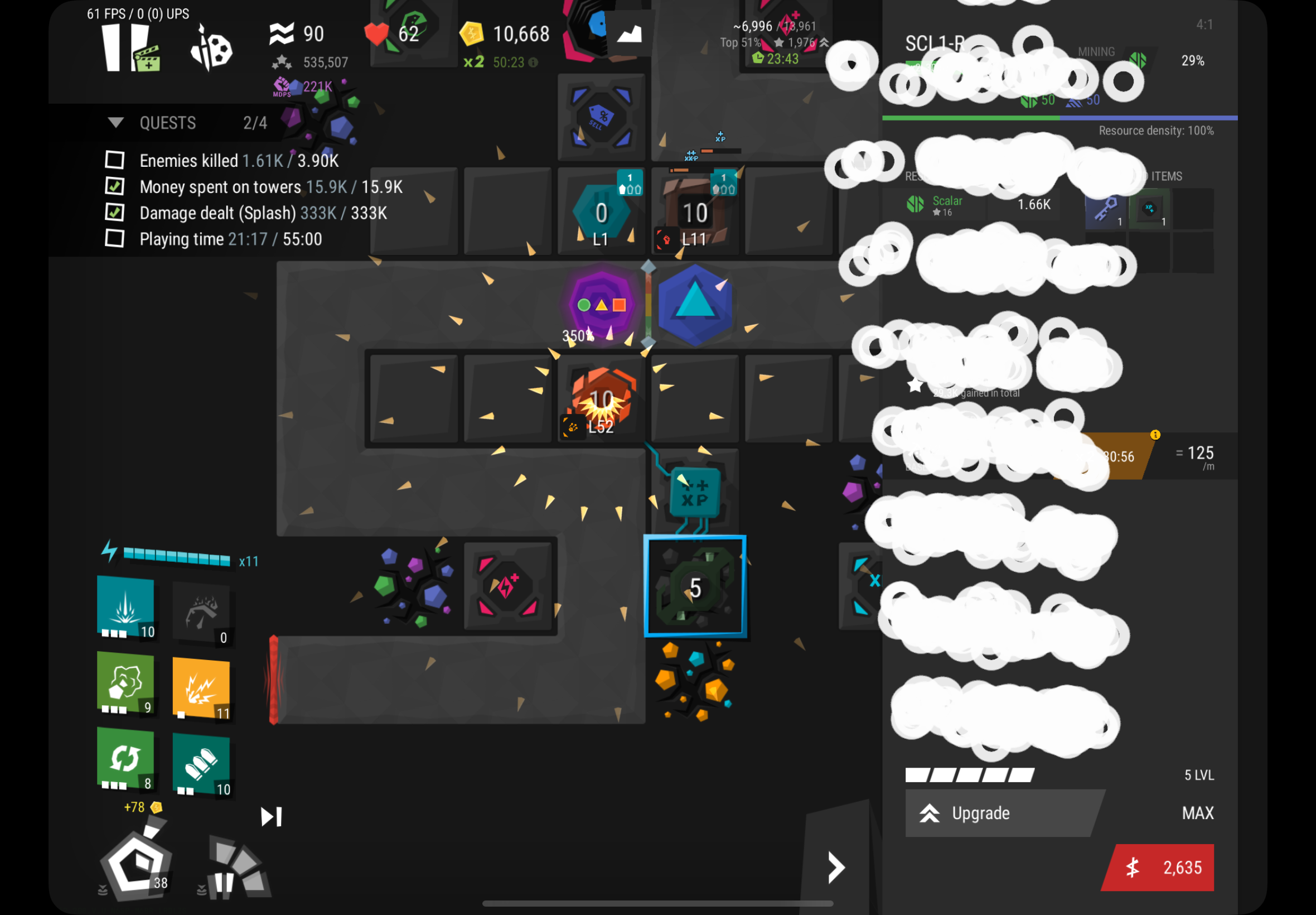 | Description | So I was waiting to upgrade the miner and I spam click the upgrade button with 2 fingers ant once and uh the bug appeared it also happens for towers. Spamming the circles (white stuff) creates another white circle above it and uh holding those circles pop up the upgrade all screen. Upgrading towers or upgrade all does not fix the issue but exiting and reentering does. | ||||